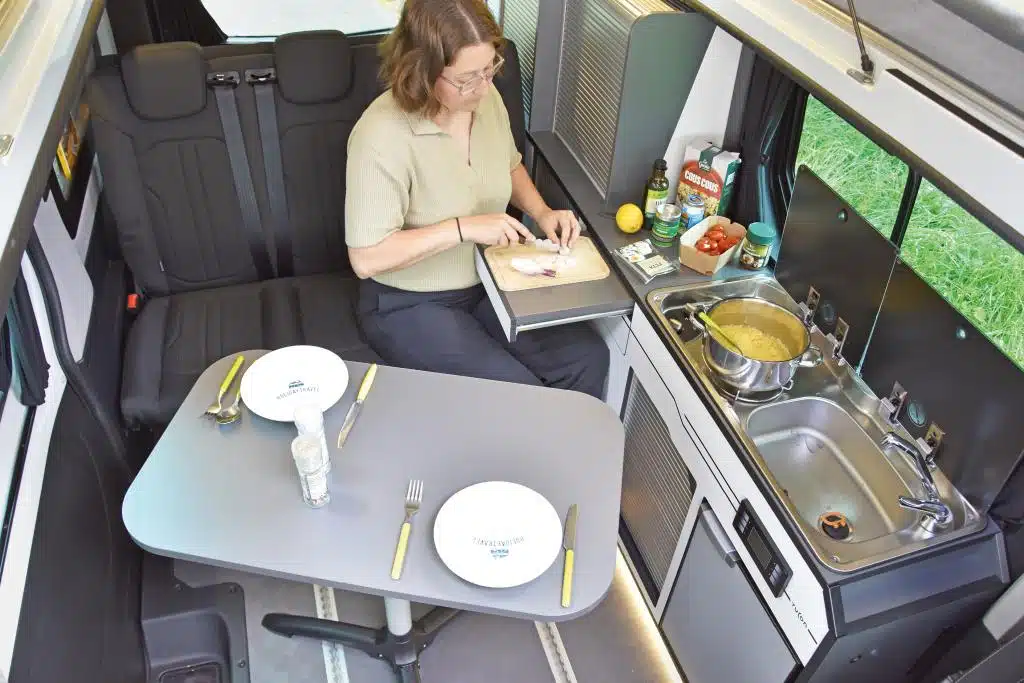 Die Küchenausstattung hat sich ebenfalls bewährt. Alles funktioniert wie am ersten Tag, und während man in anderen Campingbussen den einfachen Weg zum Restaurant wählt oder maximal einen One-Pot kocht, kann man dank mehrerer Vorratsschränke und dem großem Zweiflammkocher aus dem Vollen schöpfen.