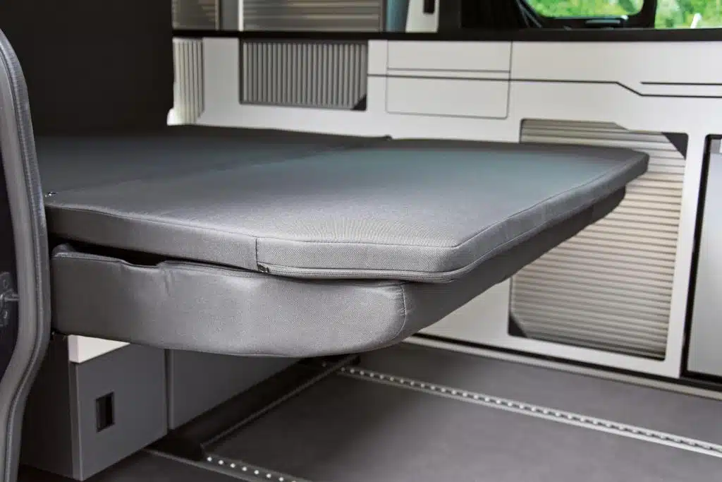 Stichwort Betten: Es läge in der Natur der Dinge, dass sich der Campingbus (mit Klappbetten), verglichen mit einem Kastenwagen (mit Festbetten) etwas schwertut. Nicht so der Yucon: Die eigens entwickelte Klappsitzbank bietet eine Liegefläche ohne nervige Konturen, und das Bett im Aufstelldach ist dank Topper (250 Euro) sogar noch bequemer. Dieses Extra sollte man sich unbedingt gönnen, auch weil der Topper keinen Stauraum frisst, sondern im geschlossenen Dach unterkommt – was nur den wenigsten Campervans bis zwei Meter Gesamthöhe gelingt. Die Bettenmaße sind zwar nicht riesig (Bank: 192 mal 118 cm, Dach: 188 mal 120 cm), aber absolut ausreichend. So bleibt selbst bis zu den gedrehten Fahrerhaussitzen mehr als ein Meter Wohnraum, auch wenn sich die Klappbank für drei Personen in der Schlafposition befindet.