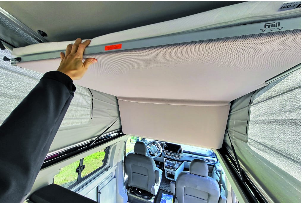 Zu den absoluten Highlights zählt die überaus praktische, integrierte Verdunkelung. Sie verschwindet in der Innenverkleidung und kann einfach nach oben gezogen werden. Sie ersetzt die zwar weitaus wohnlichere Vorhang-Lösung, aber die schwergängigen Druckknöpfe wird sicher niemand vermissen.