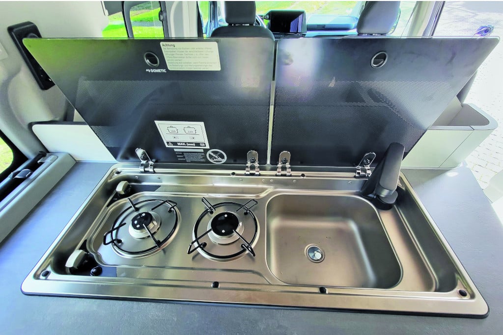 Neben dem Schubladen-Kühlschrank hat Westfalia die separate Kochstelle und Rundspüle gegen eine Kocher-Spüle-Kombination getauscht, ebenfalls von Dometic. Das sieht schick aus und verspricht etwas mehr Arbeitsfläche. Nugget-Veteranen haben das runde Waschbecken gerne mit einem multifunktionalen Schneidebrett abgedeckt.