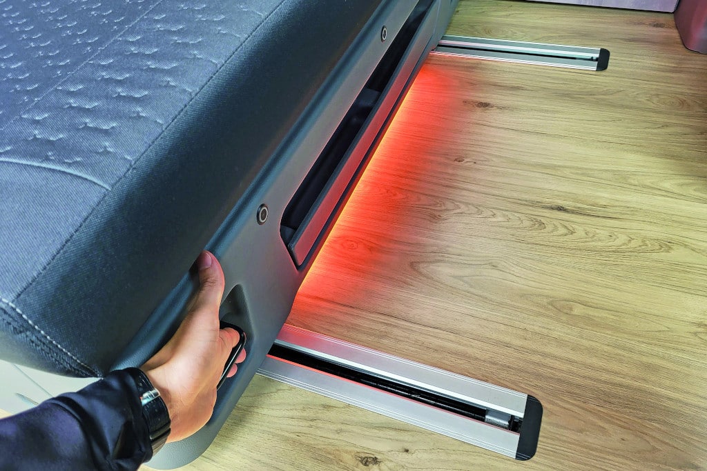 Ein wahrer Clou ist der überarbeitete Schiebemechanismus samt Bedienelementen der Sitzbank. War beim Vorgänger ganzer Körpereinsatz und etwas Nachhilfe mit Trockengleitspray gefragt, ist das nun ein Fingerspiel. Die dreisitzige Schlafbank gleitet geschmeidig über die Schienen. Für Frostbeulen dürfte die elektrische Sitzheizung interessant sein, die bei Landstromversorgung theoretisch auch beim Schlafen zur Verfügung steht.