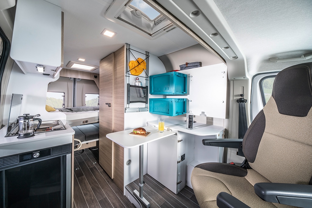 So zum Beispiel hinter dem Fahrerhaus: Wo im Kastenwagen für üblich eine Halbdinette aus Sitzbank und den drehbaren Pilotensesseln entsteht, gibt es ab Werk viel Platz, einen Technikschrank und eine große Ablagefläche und zwei Drehkonsolen für die Fahrerhaussitze. Als Tisch ist das Sideboard lediglich vom Fahrersitz aus erreichbar, den klassischen Tisch zum Einhängen (Foto) bietet Forster optional an.