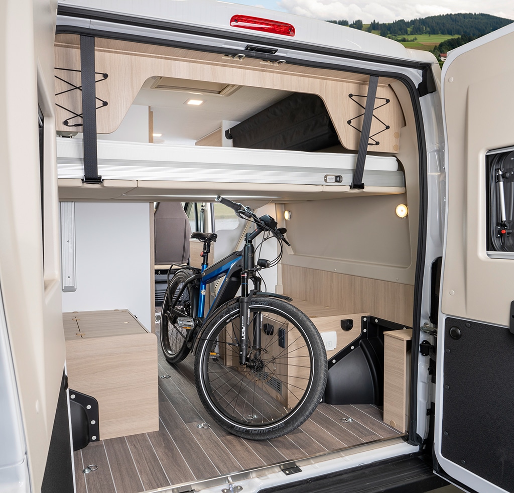 Das elektrische Hubbett hingegen gehört zur Serienausstattung. Es ermöglicht den Transport sperriger Sportausrüstung auf Knopfdruck, schränkt die Bettenmaße aber auch etwas ein, weil sich die Ducato-Karosserie nach oben hin doch ein wenig verjüngt: 180 Zentimeter Liegelänge und am Kopfende 130 Zentimeter breite misst das Bett – ausreichend für zwei Urlauber. Ein Gepäcknetz für die Decke und seitliche Kleiderstangen, an denen beispielsweise Rucksäcke befestigt werden könnten, ersetzen die seitlichen Hängeschränke.