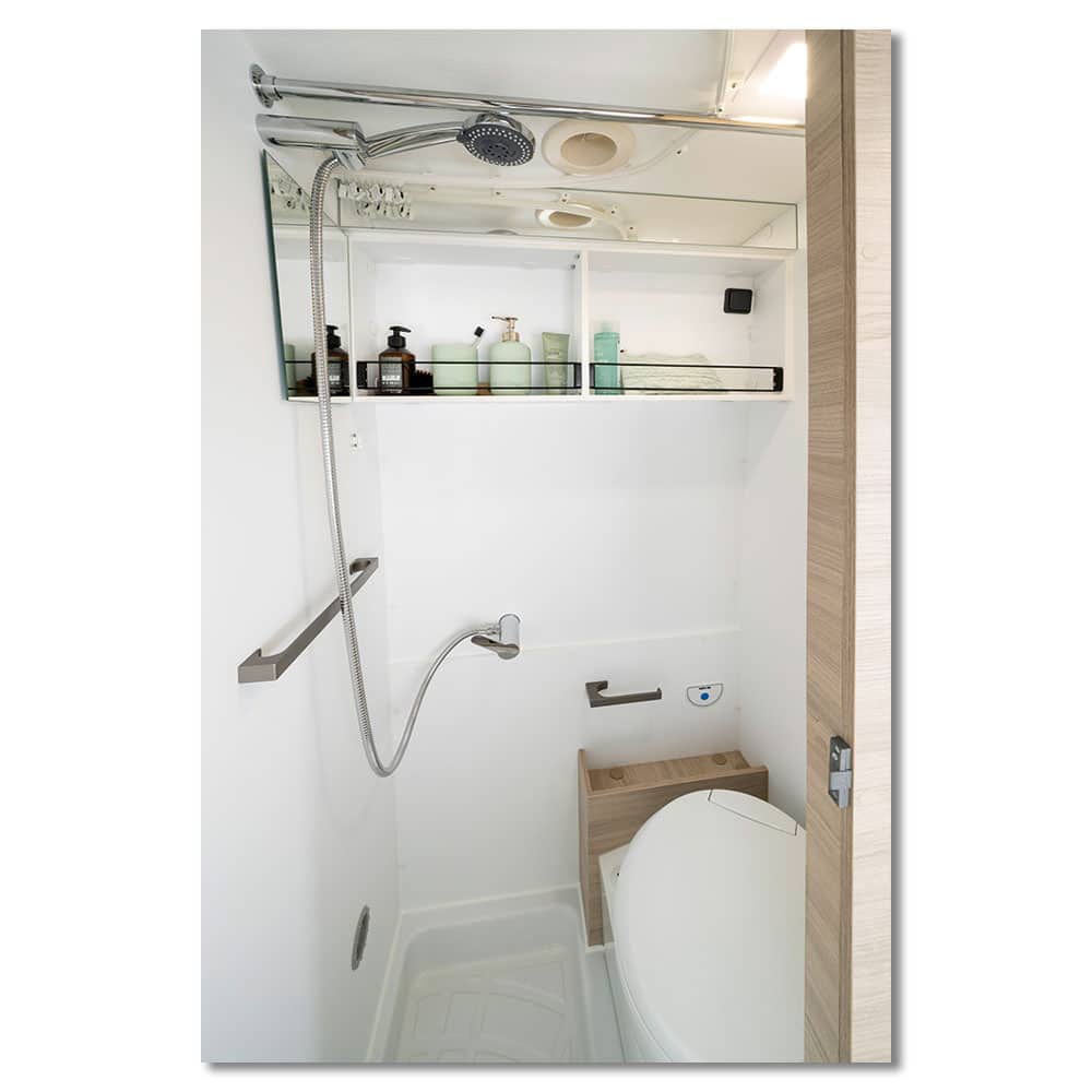 Auch in der Nasszelle nimmt Forster dem Kunden die gröbsten Arbeiten ab: die Duschtasse und eine Duscharmatur sowie die Kassettentoilette mit entsprechendem WC-Schacht sind serienmäßig an Bord. Eine Druckwasserpumpe garantiert ordentlichen Wasserdruck. Auf ein Waschbecken verzichtet der Hersteller: so bleibt mehr Platz im kompakten Bad und bis zum Küchenblock, der mit einem Spülbecken ausgestattet ist, an dem sich der Camper die Hände waschen kann, ist es nicht weit.