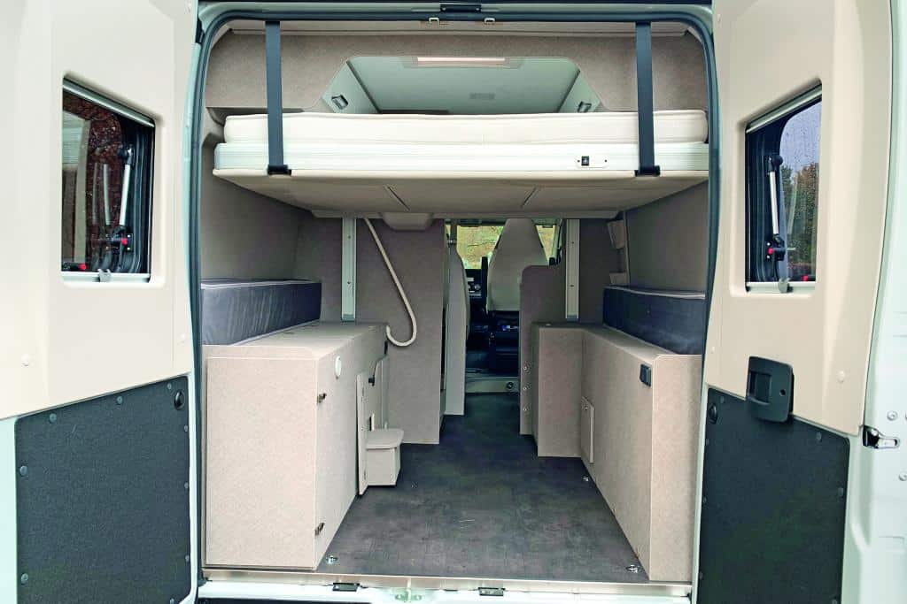 Da sich das Bett stufenlos in der Höhe verstellen lässt – praktischerweise vom Wohnraum und vom Heckstauraum aus –, lässt sich das Ladeabteil darunter auf bis zu 150 mal 192 mal 126 Zentimeter vergrößern. Selbst Fahrräder können so mühelos transportiert werden, obwohl das Bett nicht bis ganz unter die Decke gefahren werden kann. Das liegt an den seitlich über dem Bett montierten Oberschränken, auf dessen Einbau die Karmann-Entwickler zu Gunsten von Stauraum nicht verzichten. Wird das Bett auf Knopfdruck ganz herunter auf eine Höhe von 72 Zentimetern gefahren, um bequem ins Bett zu gelangen, bietet der Laderaum darunter mit 150 mal 105 Zentimeter noch ordentlich Platz für Gepäck und Campingmöbel. Durch einen herausnehmbaren Stauschrank (50 mal 50 mal 70 Zentimeter), der an den Küchenblock anschließt, bleibt die Stauraumsituation des Vans sogar weiterhin flexibel – ein sinnvoller Kompromiss in Sachen Stauraum und Liegekomfort, bei dem die erwähnten Fahrräder nachts allerdings ausgeladen und draußen geparkt werden müssen. Wer beides – also das Bett nutzen und die Fahrräder im Fahrzeug verstaut wissen – will, der muss mit eingeschränkter Kopffreiheit und knappen Bettenmaßen (160 mal 160 bis 190 Zentimeter) leben.