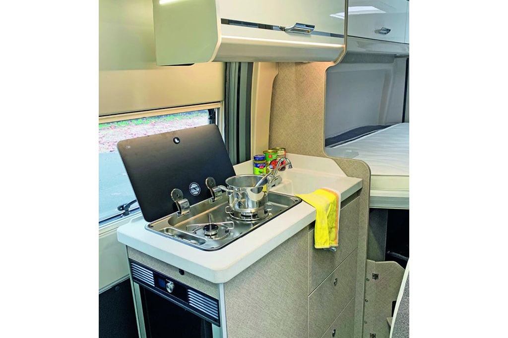 Die Arbeitsplatte der kompakten Längsküchenplatte (98 mal 49 Zentimeter) samt eingelassener Spüle (32 mal 32 Zentimeter), in der sich bis zu 24 Zentimeter hohe Töpfe abspülen lassen, besteht aus widerstandsfähigem Mineralwerkstoff. Arbeits- und Ablagefläche ist jedoch nur in Form der Glasabdeckung des Zweiflammkochers (inklusive elektrischer Zündung) vorhanden. Gut gemacht: Die Tür des an der Stirnseite des Küchenmöbels montierten Kompressorkühlschranks (70 Liter) ist beidseitig angeschlagen und lässt sich somit praktischerweise auch über die geöffnete Schiebetür bequem öffnen. Etwa, um beim Grillen im Sommer leichter an ein kühles Bier zu gelangen.