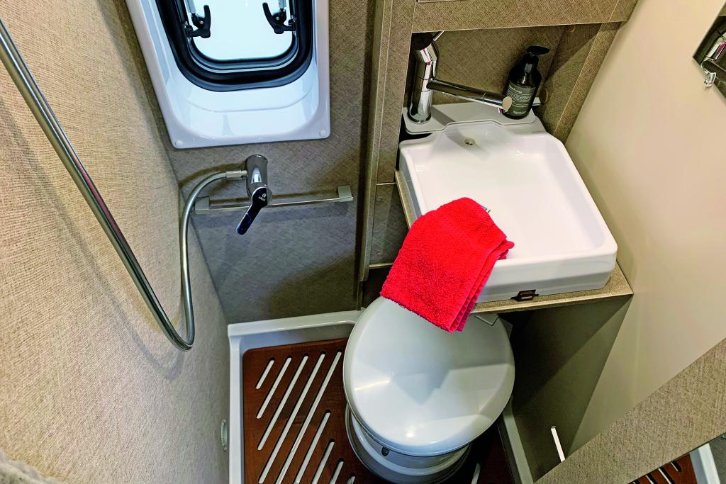 Das kompakte Längsbad gegenüber auf der Fahrerseite misst 80 mal 60 bis 66 Zentimeter in der Grundfläche. Um die knapp gehaltene Bewegungsfreiheit nicht weiter einzuschränken, baut Karmann ein Klappwaschbecken (36 mal 30 Zentimeter) aus Kunststoff ein. Stauraum gibt es dadurch aber eher wenig. Der Badedunst entweicht über ein Fenster zügig ins Freie. Der schmale Mittelgang des Davis 610 LS macht den Einbau einer zweiteiligen und mittig geteilten Klapptür nötig. Ist sie geöffnet, ragt sie 20 Zentimeter in den Gang hinaus, sodass sie den Durchgang in den vorderen oder hinteren Wagenteil versperrt.