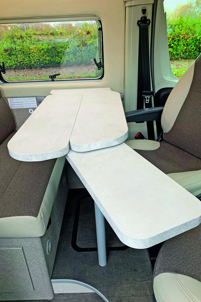 Um die Bewegungsfreiheit und den Komfort an der Halbdinette zu erhöhen, greift Karmann auf einen pfiffigen Trick zurück. Denn letztlich beträgt der Abstand zwischen der Badezimmerwand und der B-Säule des Basisfahrzeugs lediglich 110 Zentimeter. Da muss jeder Zentimeter ausgenutzt werden, um die Bewegungsfreiheit und das Platzangebot zu maximieren. Deshalb lässt sich die klappbare Tischplatte in drei Größen gliedern. Um leichter in die Sitzgruppe einzusteigen, wird sie schmal gehalten (93 mal 23 Zentimeter), um zu zweit am Tisch zu essen, verbreitert sie sich auf 45 Zentimeter. Und damit auch ein Camper vom gedrehten Beifahrersitz aus Platz an der Tafel findet, wird eine 41 mal 23 Zentimeter große Tischverlängerung ausgefahren. Eine, wie wir meinen, gute Konzeptlösung, obwohl der Tisch stets eher schmal bleibt. Jungen Familien bietet Karmann noch die Möglichkeit, optional ein kleines Kinderbett aus der Sitzgruppe bauen zu können (530 Euro), das jedoch weitere Abstriche bei der Bewegungsfreiheit bedeutet. Besser also das Aufstelldach (7.890 Euro) wählen, wenn es das Budget zulässt.