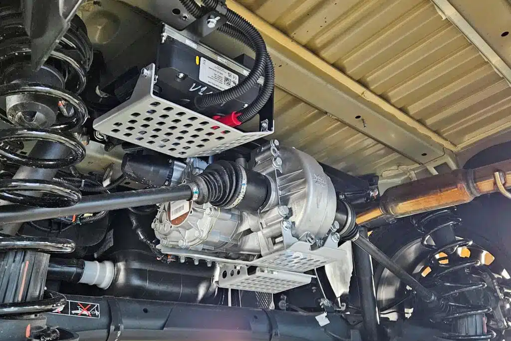 Die Energieversorgung übernimmt ein LFP-Akkupack mit einer Kapazität von 4,8 kWh. Der Preis für den Allradumbau liegt bei 9.250 Euro. Im Paket enthalten sind ein Unterfahrschutz für Motor, Getriebe und Tank sowie eine Höherlegung um 90 Millimeter. Da die Ansteuerung des Hinterradantriebs vollständig elektronisch erfolgt, kann auf mechanische Komponenten wie ein Mitteldifferenzial oder eine Kardanwelle verzichtet werden.
