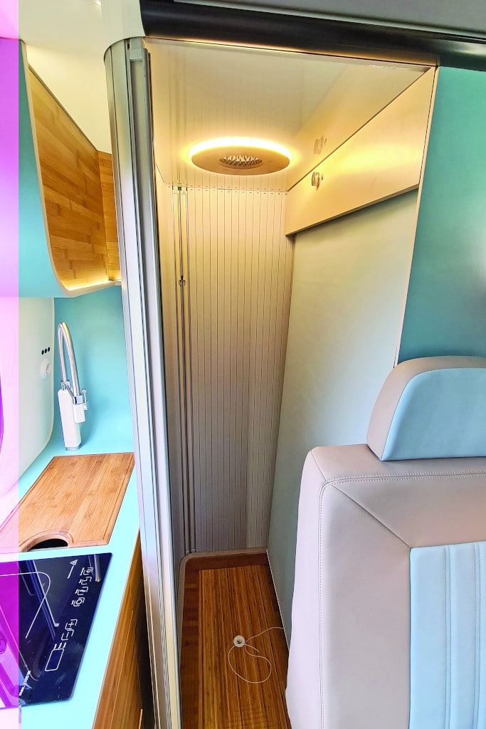 Öffnet sich die Schiebetür, fällt der Blick direkt auf ein Highlight des Campervans: die abgerundete Küchenzeile mit Bambusholzfurnier, pastellblauer Arbeitsfläche und der umlaufenden Beleuchtung. Das Ambientelicht kann je nach Vorliebe und Stimmung gewechselt werden. Gekocht wird auf einer Einzel-Induktionskochplatte. In einem kleinen Schrank neben der Spüle versteckt sich eine Smeg-Siebträgermaschine. Eine weitere, kleine Design-Besonderheit ist die cremeweiße Küchenarmatur von der Kultmarke Smeg. Der 130-Liter-Kühlschrank – ebenfalls in Cremeweiß und von Smeg – ist gegenüber platziert und wurde extra auf 12-Volt-Betrieb umgebaut. Weitere Details zeigen wir in der Galerie weiter unten.