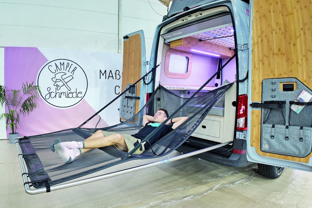 Auf dem Caravan Salon präsentierte das Team noch ein weiteres Highlight: eine von der Camper Schmiede selbst erfundene Hängematten-Konstruktion fürs Heck namens Soul Floater mit 200 Kilo Tragkraft, auf der zwei Personen entspannt Platz finden. Den Soul Floater bietet die Camper Schmiede übrigens für knapp 2.000 Euro auch zur Nachrüstung für MAN, Sprinter- oder Crafter-Fahrzeuge an.