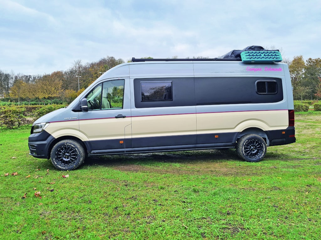 Das Basisfahrzeug ist ein 6,80 Meter langer MAN TGE 3.180 mit 177 PS und Achtgang-Automatikgetriebe mit Frontantieb. Die Camper Schmiede spendierte dem Van noch eine 60-Millimeter-Höherlegung sowie ein Zusatz-Luftfahrwerk an der Hinterachse. Für einen dezenten Offroad-Look sorgen zudem All-Terrain-Reifen von Loder, die den Van auch mal problemlos über eine nasse Wiese oder Schotterpiste tragen sollen.