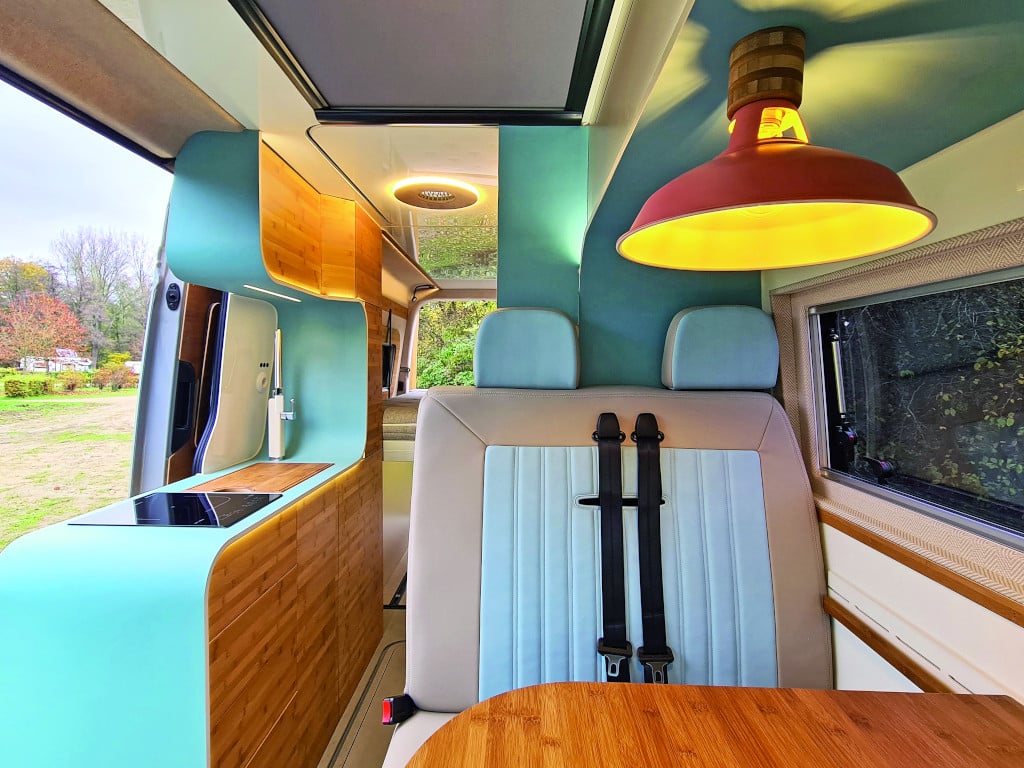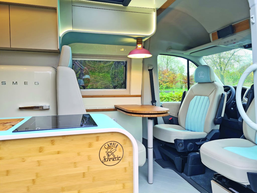 Die beiden drehbaren Vordersitze und die Rücksitzbank sind, abgestimmt auf das Gesamtbild, mit cremefarbenem und blassblauem veganem Leder bezogen. Dazwischen befindet sich ein knapp 80 Zentimeter langer und 45 Zentimeter breiter Tisch aus Bambus-Vollholz. Mit der drehbaren Erweiterungsplatte wächst der Tisch auf 122 Zentimeter Länge. Darüber spendet eine rosafarbene Lampe, ebenfalls im Retrostil, warmes Licht. Für den Einsatz im Marylin wurde die ursprüngliche Hängelampe mit Bambusringen am abgerundeten Hängeschrank über der Halbdinette fixiert. Auch im Cockpit wird das Design mit zweifarbigem Alcantara eingehalten.