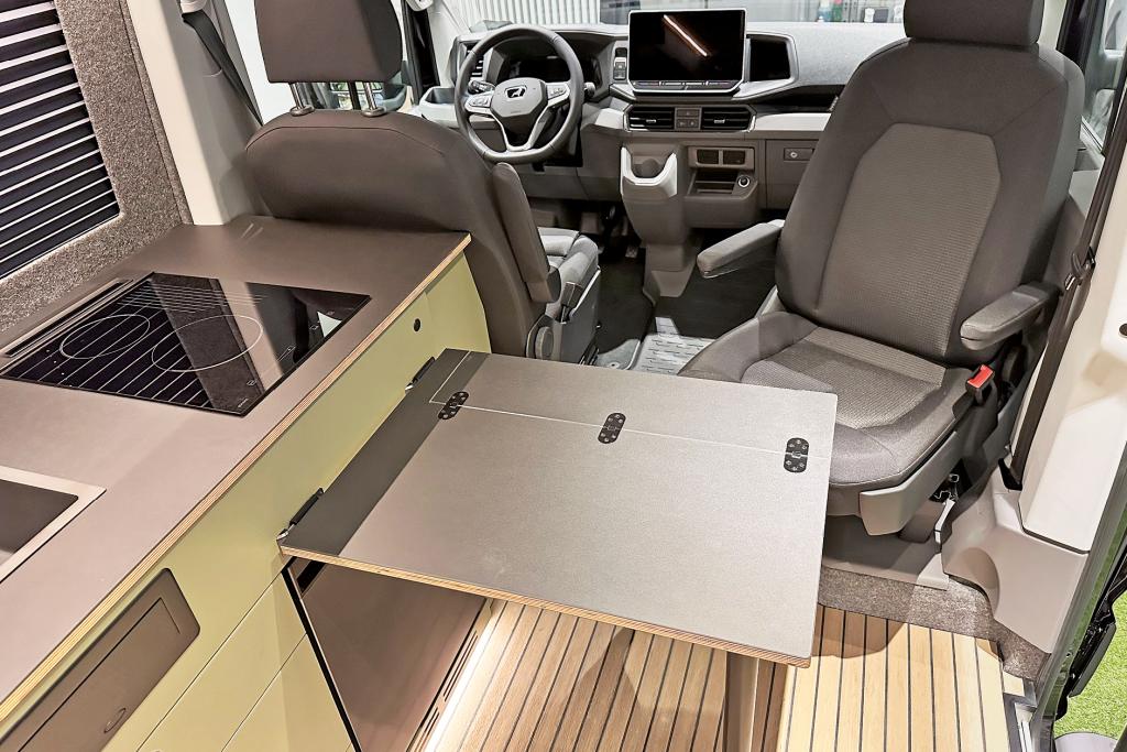 Der Grundriss sieht eine fahrerseitige Möbelzeile vor, auf die zwei gegenüberliegende, 70 Zentimeter breite Hocker folgen. Über diese kann das Bett auf 200 mal 160 Zentimeter ausgezogen werden – dann schläft man bequem in Längsrichtung. Der Tisch kann derweil an der Küchenzeile eingehängt und somit von einer Person genutzt werden, wenn die andere noch im Bett liegt.