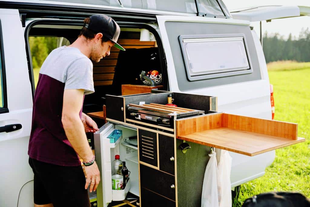 Die zweite Schiebetür und ein schwenkbarer Küchenblock ermöglichen es, sowohl drinnen als auch draußen zu kochen. Das Kochen im Freien wird auch durch den ausziehbaren Wasserhahn erleichtert. Auch der Kühlschrank schwenkt mit – ein Novum.