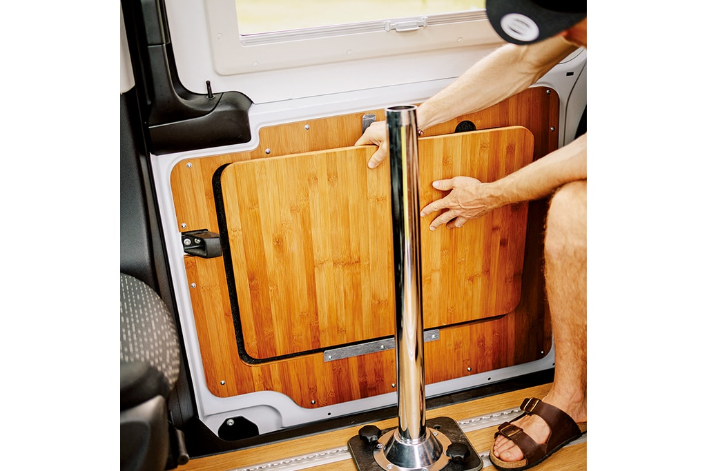 Durch den optimierte Ausbau des Campers sind die Schränke immer zugänglich. Zwei Schiebetüren sind Serie, eine wird mit einer praktischen Tischhalterung ausgestattet. Der Tisch kann sowohl im Camper als auch draußen aufgebaut werden. Somit ist der Camper auf verschiedene Wetterbedingungen ausgelegt.