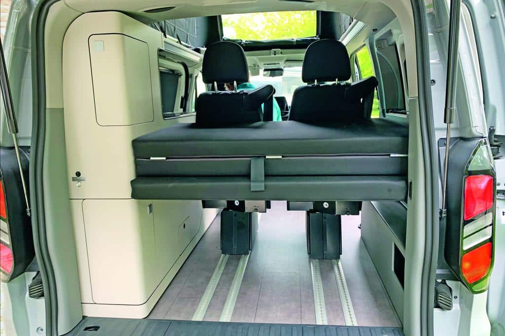 Der Ausbau des mindestens 64.990 Euro teuren Campingbus umfasst ein leichtgängiges Aufstelldach mit Einhandverriegelung und 200 mal 127 Zentimeter messenden Bett mit unterlegten Tellerfedern, USB-Steckdose und zwei Schwanenhalsleuchten.