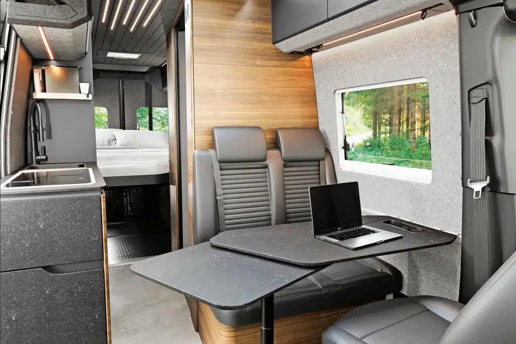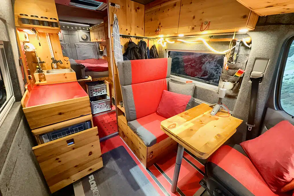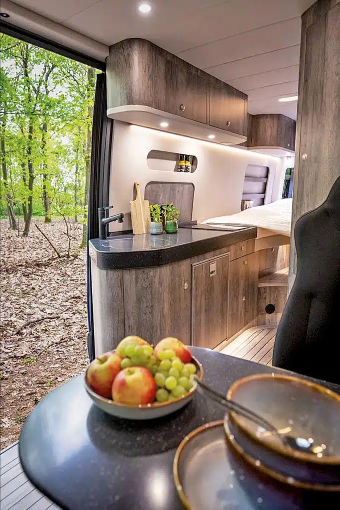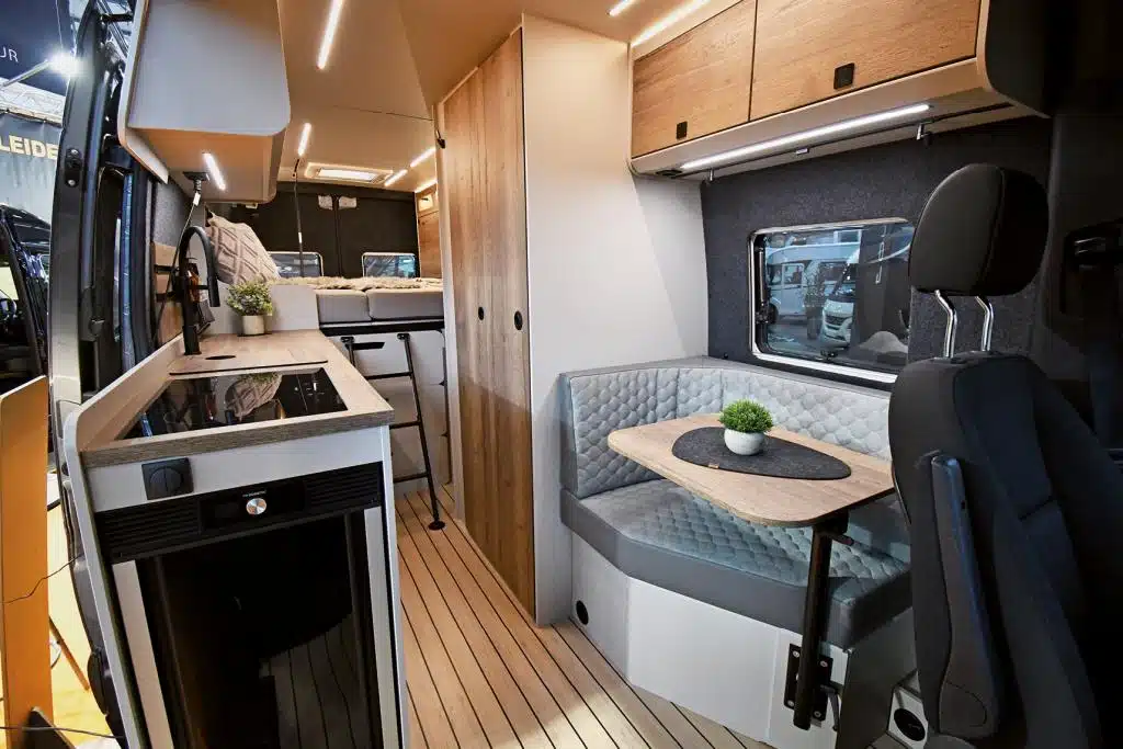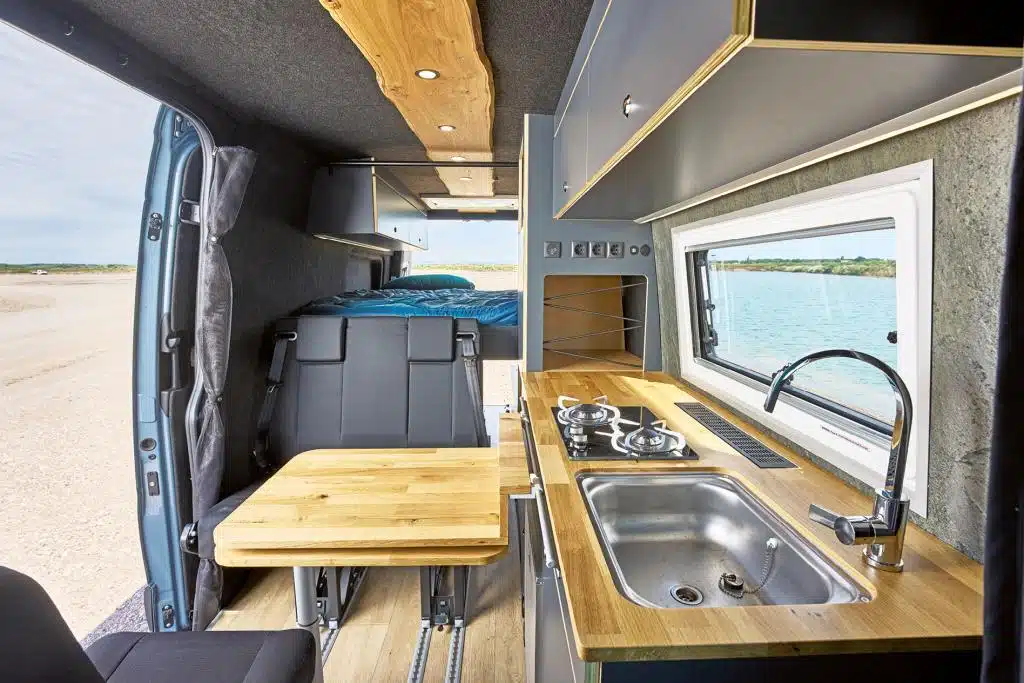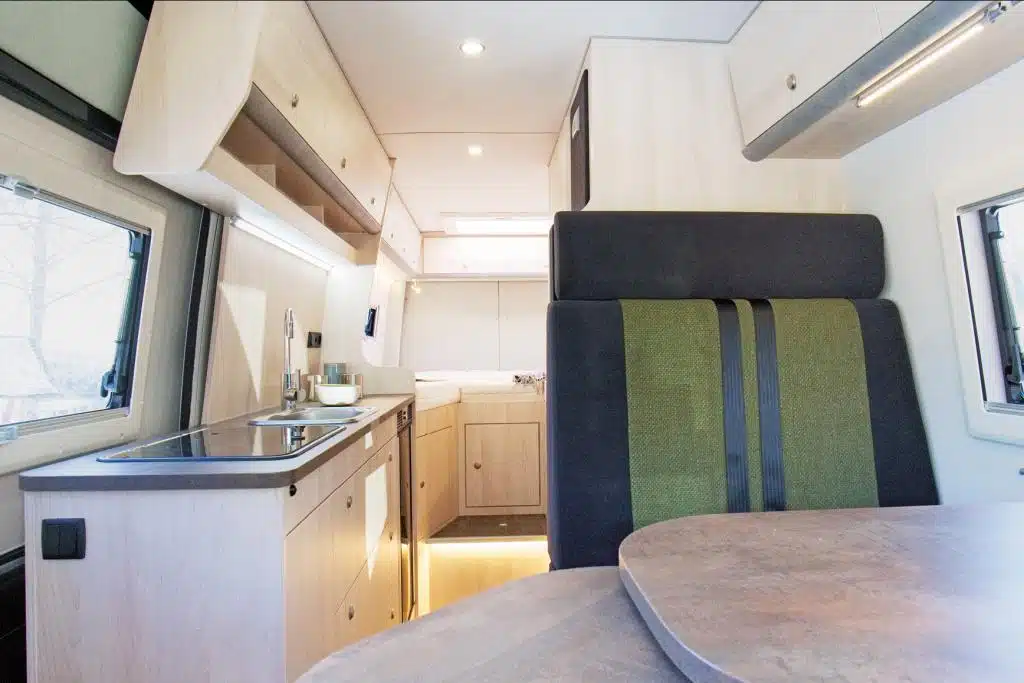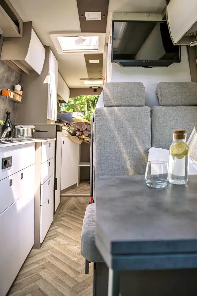 Groß geworden ist Veo Vans – ehemals Vanlife Manufaktur – als Individualausbauer. Heute gibt es mehrere Vorlagen, die auf Kundenwunsch angepasst werden können, bis der persönliche Traum-Camper erst auf einem Anfrageformular, dann als digitales 3-D-Modell geplant und schließlich ganz real gebaut wird. Perfektes Beispiel: Der Yeti Family, hier mit fünf Sitz- und Schlafplätzen. Den Grundriss kennt man eher von den viel kompakteren Campingbussen: Fahrerseitig gibt es eine durchgängige Möbelzeile mit deckenhohem Schrank im Heck und Küchenblock davor. Der Möbelbau besteht aus wasserfest verleimtem Pappel-Multiplex mit HPL-Beschichtung, Steinfolie und einer Arbeitsplatte aus Wildeiche. Das Material findet sich als Tischplatte wieder und als durchgehende Diele mit Naturkante und eingelassenen LED-Spots an der Decke. Geschlafen wird auf einem Querbett im Heck, auf einer Klappbank und in einem Dachzelt.
