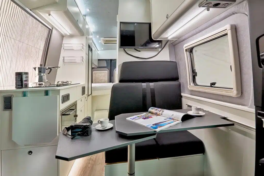 Mit Querbett verfügt der Sprinter über eine besonders lange Küchenzeile, die ab Werk mit einer Kocher-Spüle-Kombination und einem stirnseitigen Kühlschrank ausgestattet ist. Die Halbdinette mit 80 mal 56 Zentimeter großem, freistehendem Tisch fällt selbst für Sieben-Meter-Sprinter großzügig aus.