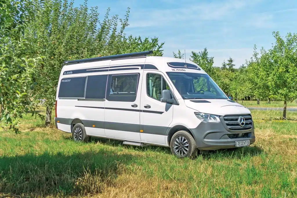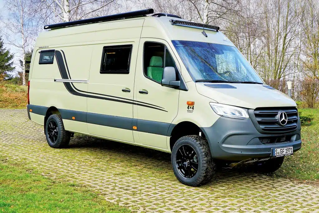 Die sehr lange Küchenzeile bietet viel Arbeitsfläche und einen deckenhohen Vorratsschrank, die Nasszelle genug Bewegungsfreiheit, auch dank Schubladen-Waschbecken. Dazwischen bleibt der Mittelgang mindestens 52 Zentimeter breit – im Sprinter ein sehr guter Wert. Gleiches gilt für die Sitzgruppe mit breitem Tisch und serienmäßiger Erweiterung. Wenn mal ein Notbett benötigt wird: Die Sitzgruppe kann ohne Zusatz-Polster zur Liegefläche umgebaut werden. Alternativ ist auch ein SCA-Aufstelldach verfügbar. Der Basispreis liegt bei 97.400 Euro, die All-Inclusive Version mit Allrad und großem Autarkie-Paket bei vergleichsweise fairen 122.500 Euro.