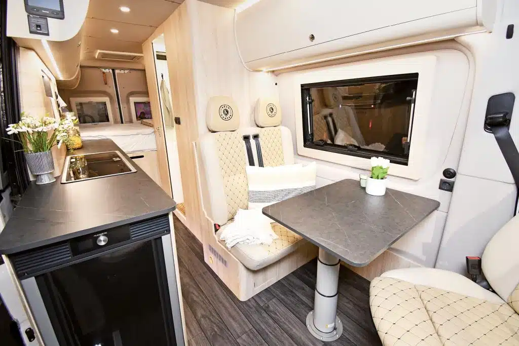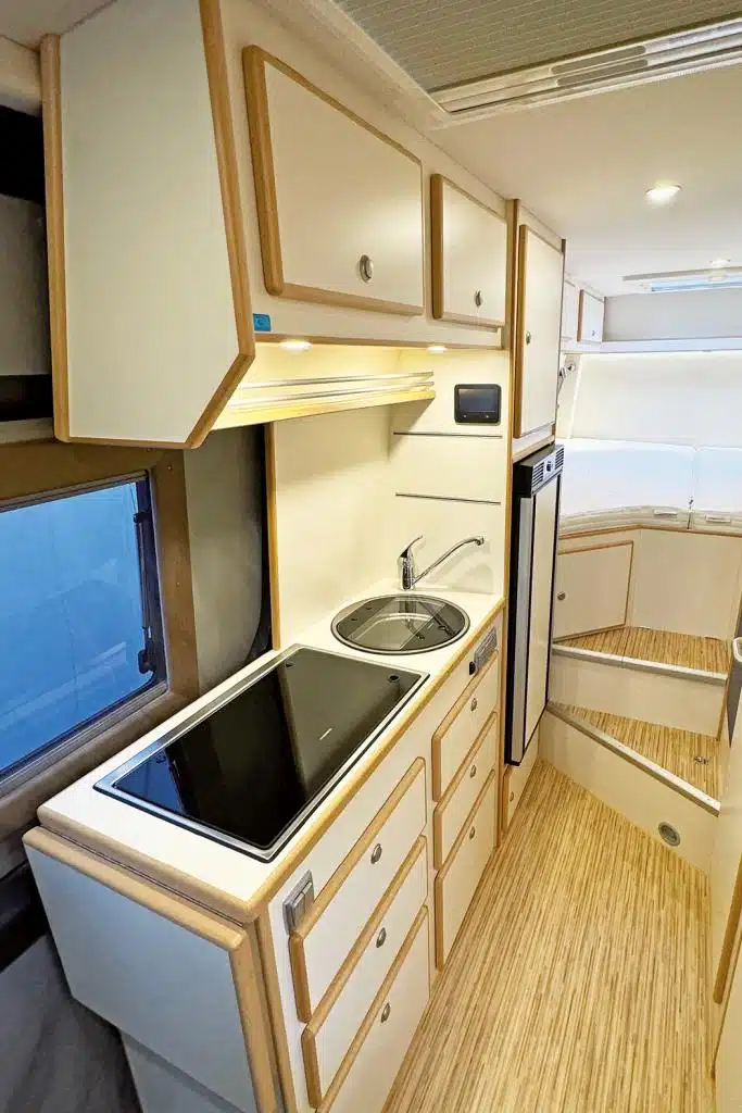 Der Möbelbau besteht aus besonders leichtem Albasia-Holz, das in den verschiedensten Furnieren angeboten wird. Das serienmäßige Elektrik-Paket beinhaltet eine 105-Ah-Lithium-Batterie, einen Wechselrichter und ein Solarmodul. Die Steuerung der Geräte erfolgt über ein Touchpanel. Gas wird in einem 50-Liter-Außentank gespeichert, der auf Wunsch auch einen Backofen speist. Individualität und Ausstattung erklären den Grundpreis von 195.000 Euro. Das Fotofahrzeug kommt sogar auf 225.148 Euro.