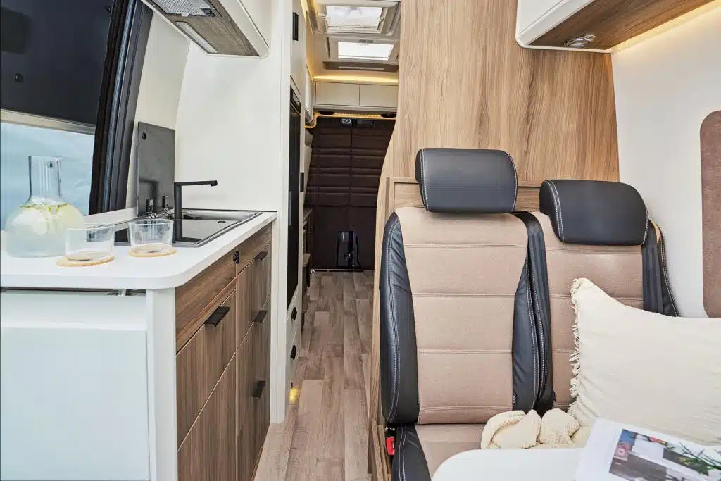 Auch Innova adaptiert seinen hochwertigen Ausbau im Stil des niederländischen Jachtbaus auf den knapp sieben Meter langen Mercedes-Benz Sprinter 319 L3. Durch den zusätzlichen Meter Wohnraum bleibt Platz für einen Einzelsitz in zweiter Reihe, der zuvor, im Roadtrip 595L, noch Längsbetten weichen musste. Insgesamt sind nun also drei gurtgesicherte Sitzplätze an Bord. Auch wachsen die Betten um rund zehn Zentimeter auf zwei Meter Liegelänge und die Küchenzeile, an der Innova nun einen zusätzlichen Induktionskocher unterbringt. Dank erweitertem Energiepaket mit Lithium-Batterien und Wechselrichter ist dessen Stromversorgung sichergestellt. Gas bleibt allerdings als Option verfügbar.