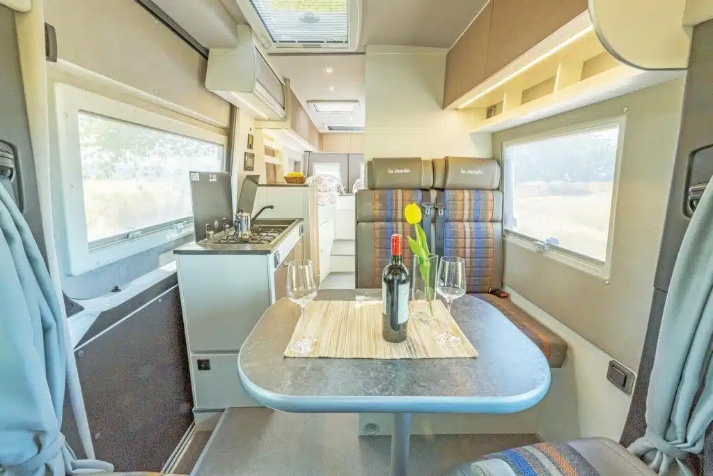 Ebenfalls optional kann der Roadtrip 695L auch mit Doppelbank in zweiter Reihe oder einem noch größeren Tisch konfiguriert werden. Dieser kann durch den bereits vom 595L bekannten „Pizza-Tisch“ – die Abdeckung der Spüle mit 37 Zentimeter Durchmesser – ergänzt werden. Basispreis: 159.500 Euro.