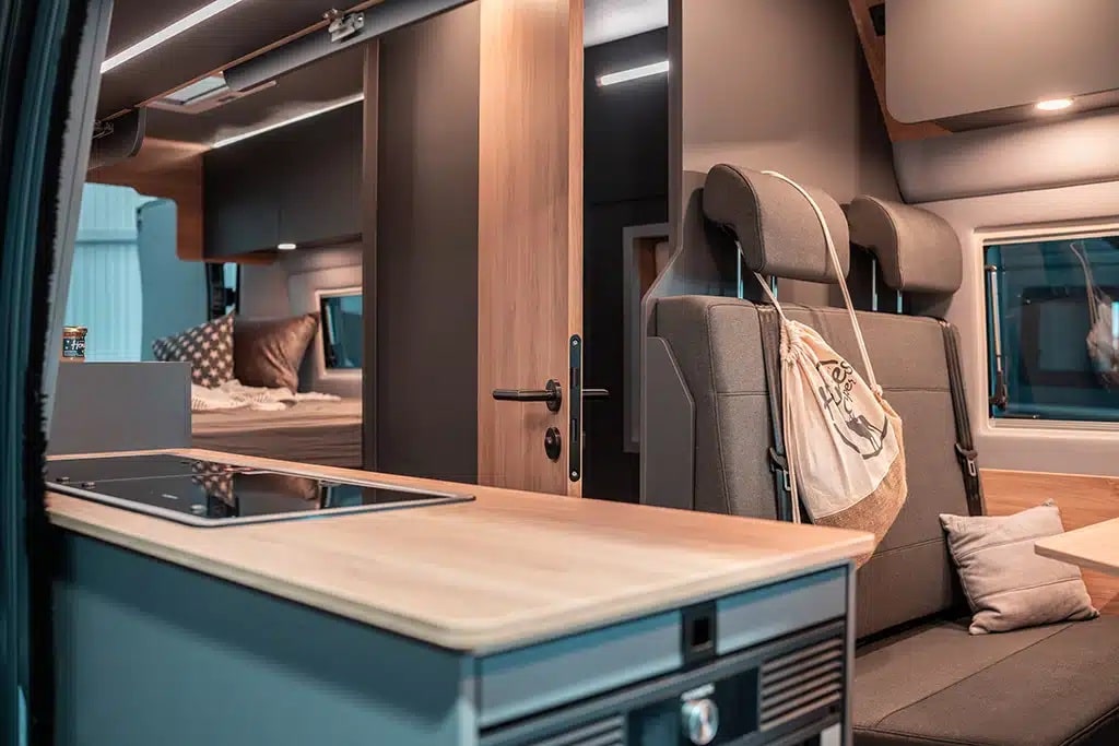 Erneut geht es um ein modernes, besonderes Wohlfühlambiente, kombiniert mit hoher Qualität und einer überdurchschnittlich guten Serienausstattung. Im Vergleich zum bekannten Hannes Camper ist der Viica Van mehr eine zweite, etwas dunklere Wohnwelt, die Grundrisse – wieder ein 600er mit Querbett und ein 640er als Längsschläfer – wurden nur im Detail angepasst. Neu ist etwa der schwenkbare Waschtisch im Bad, der zusätzlichen Platz zum Duschen schafft. Die Dachstauschränke sind teils offen, teils mit grifflosen Klappen versehen.