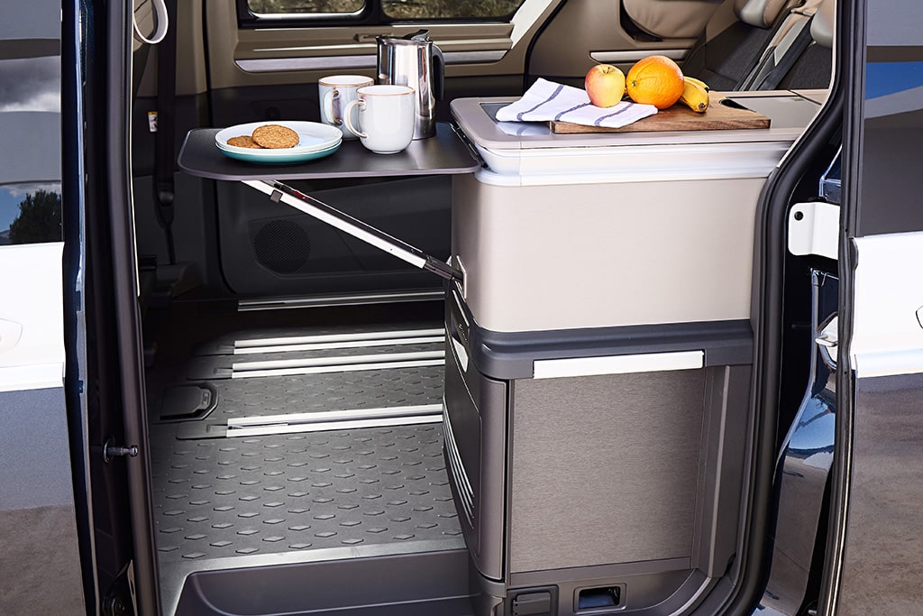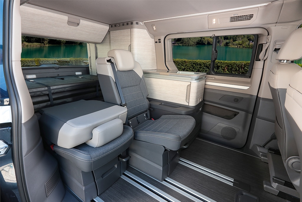 Der größere Tisch (83 mal 51 Zentimeter) kommt leider nicht mehr in der Schiebetür unter, aber auch er kann nun am Küchenblock eingehängt werden, sodass die Platzverhältnisse an der Sitzgruppe auf dem Niveau des Vorgängers liegen. Auf dem Fahrersitz ist dank gekürztem Küchenblock sogar deutlich mehr Platz, auf dem äußeren Einzelsitz im Fond konkurriert man hingegen mit dem Tischbein.