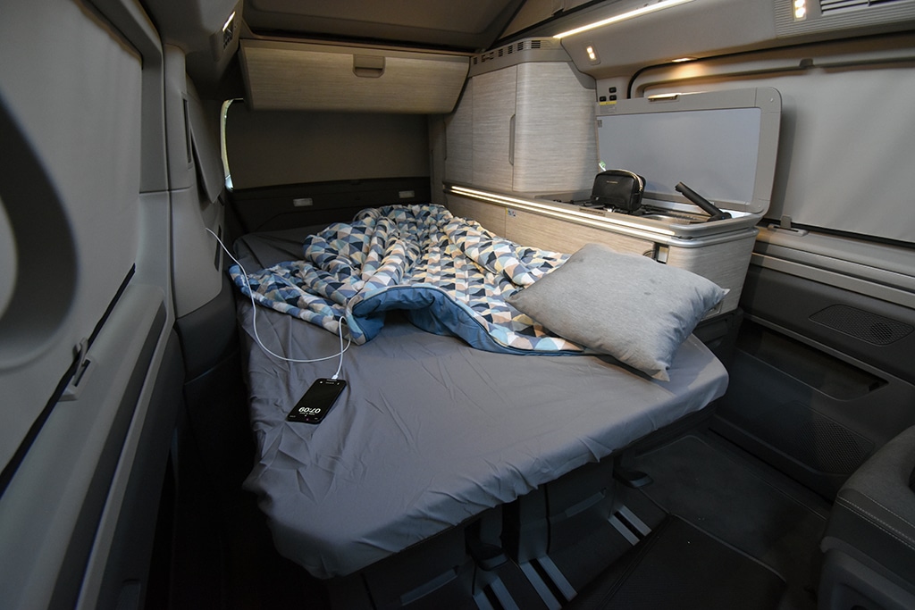 Weil sich das Bettenmodul fahrerseitig auf dem Möbel abstützt, funktioniert die Konstruktion auch mit nur einem Einzelsitz. Dann könnte links beispielsweise eine Hundebox oder eine Toilette gestellt werden. Beim Schlafkomfort übertrifft der neue California seinen Vorgänger locker, obwohl die Liegefläche acht Zentimeter schmaler geworden ist und die Matratze, anders als im Caddy California, keine integrierten Tellerfedern bietet. Doch zu zweit wird’s sicherlich eng.