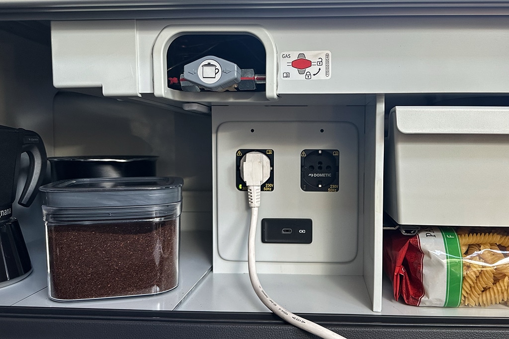 Beim Campen hingegen kann VW nicht kaschieren, dass der wertvollste Stauraum in einem Campingbus – nämlich der im Küchenblock – nun eindeutig kleiner ausfällt. Immerhin hinter einer praktischen Schiebetür, kommen hier gerade noch das Besteck und ein kleiner Topf, die Bialetti, etwas Kaffee und zwei Packungen Nudeln unter.