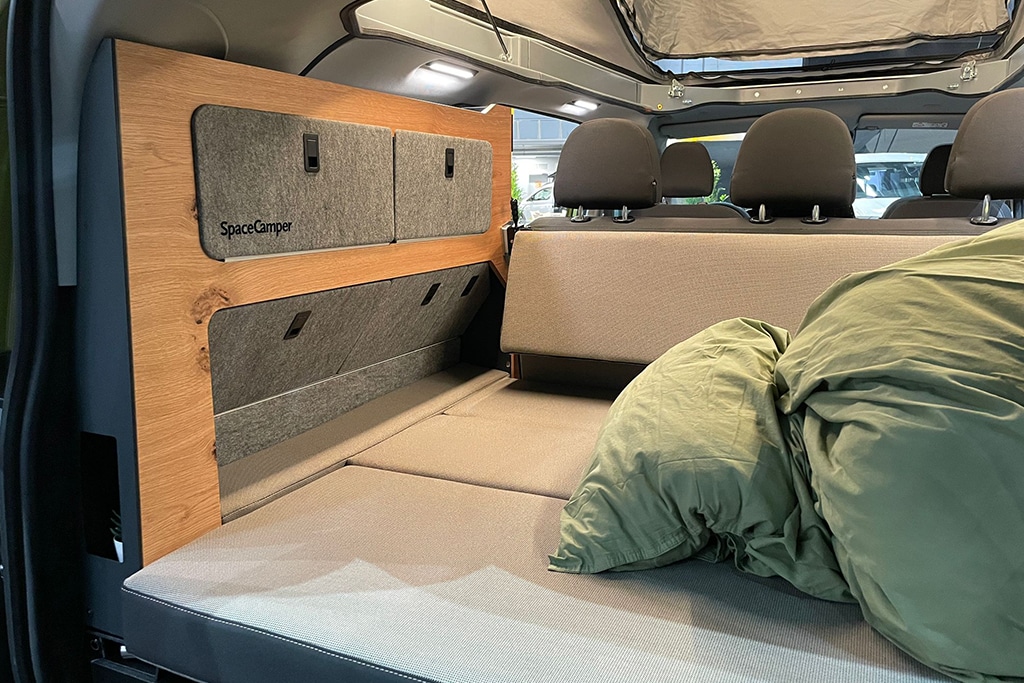 Geschlafen wird entweder auf der 1,10 x 2 Meter großen Zwei-Schicht-Matratze im Aufstelldach, die mit Tellerfedern unterfedert und auch unterlüftet ist, oder auf der Rückbank, die eine Liegefläche von 1,38 x 2 Meter bietet. Durch die bereits erwähnte Matratzenerweiterung kann die Breite auf 1,5 Meter wachsen.