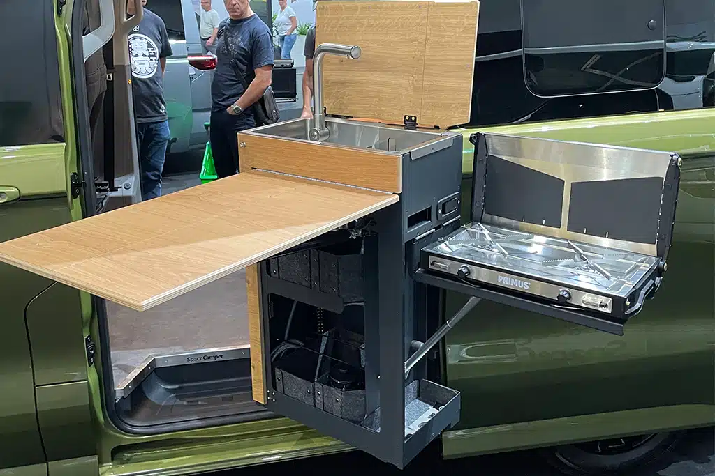Doch damit die zweite Schiebetür auch genutzt werden kann, ist die Küche als vorderster Baustein der Möbelzeile nach außen schwenkbar. So kann man draußen kochen und auch von links einsteigen. Möchte man sein Basislager weiter ausbauen, kann man den Küchenblock auch ganz aus dem Fahrzeug nehmen und zum Beispiel im Vorzelt platzieren. Ausklappbare Beine aus Aluminium-Vierkantrohr sorgen für einen sicheren Stand der Küche.