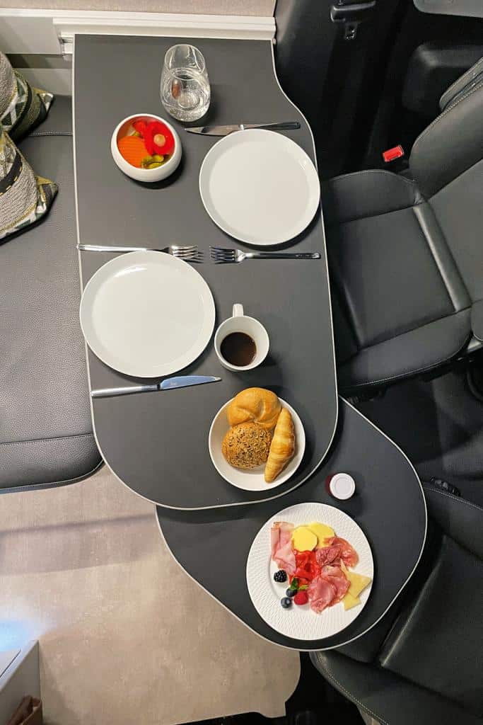Haken fürs Geschirrtuch und eine 230-Volt-Steckdose sind ab Werk verbaut, weiteres Zubehör optional erhältlich. Im Testwagen ist besonders das magnetische Geschirr von Silwy zu erwähnen, aus Echtglas und Porzellan, sehr hochwertig, aber auch ordentlich schwer und teuer.