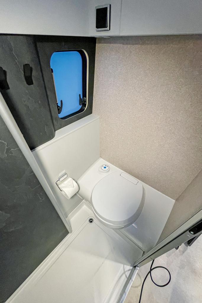 Das Kompaktbad aus dem kurzen Grand Canyon S (90 mal 75 Zentimeter) ist in der Länge um über 30 Zentimeter gewachsen. Statt dem Duschvorhang, der einem auf wenig Raum immer am Körper klebt, teilen eine Schwenkwand und eine Gliedertür den Toiletten- vom Duschbereich. Auch durch das platzsparende Klappwaschbecken: Die Bewegungsfreiheit ist wirklich erste Klasse, höchstens für überdurchschnittlich große Camper in der Stehhöhe eingeschränkt.