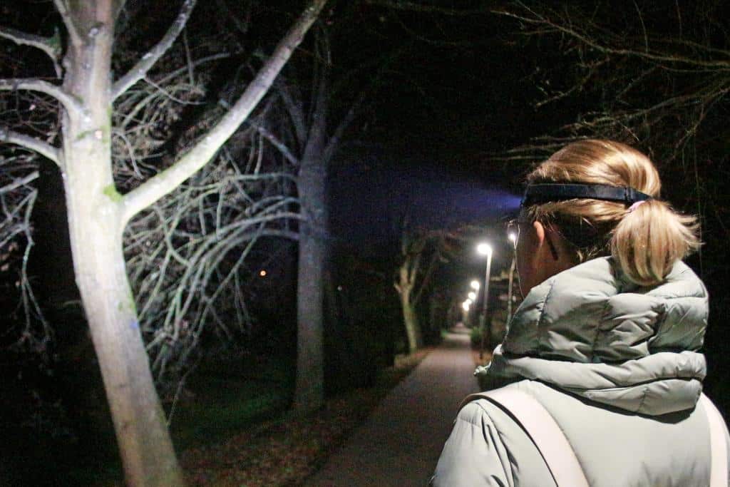 Der Tragekomfort ist hervorragend – die Lampe ist kaum spürbar, das Kopfband lässt sich einfach einstellen und passt sich gut an. Die Bedienung über die Ein-/Ausschalttaste ist einfach und intuitiv, was bei wenigen Funktionen auch kein Wunder ist. Der Lampenkopf lässt sich in fünf Raststufen nach unten schwenken – ohne zu haken und nahezu lautlos. Auch die Transportsperre sowie die Lade- und Batteriestandanzeige in drei Stufen (rot <15 %, gelb 15–40 %, grün 40–100 %) kommen gut an. Einziger Nachteil: Mit Schutzklasse IP X4 ist sie nicht ausreichend gegen starken Regen geschützt.