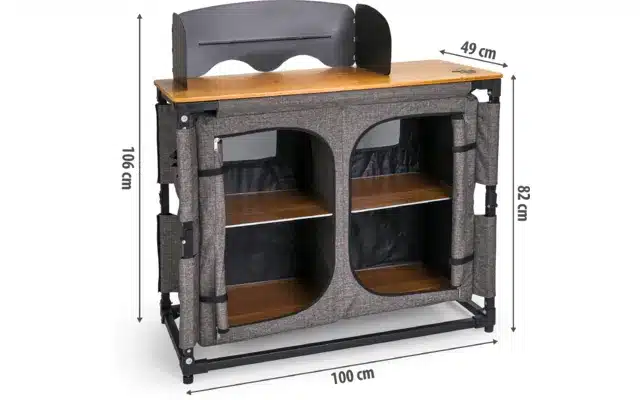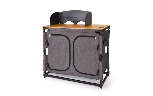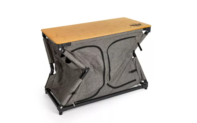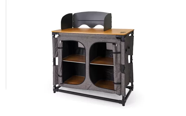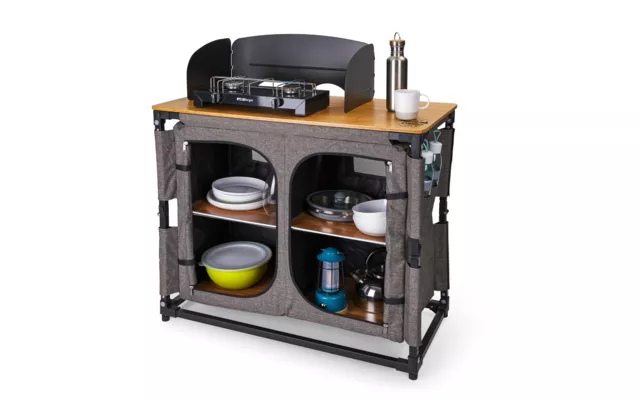 Diese vielseitige Küchenbox ist mehr als nur eine mobile Kochstation – sie eignet sich auch perfekt als Campingschrank. Die Küchenbox ist mit ihrer speziellen Falttechnik mit nur wenigen Handgriffen einsatzbereit. Zudem überzeugt die Box durch eine besonders robuste, langlebige Konstruktion, die eine Belastbarkeit von bis zu 30 kg aushält.