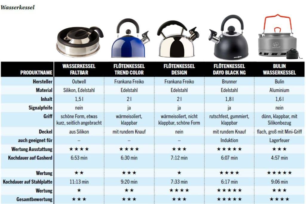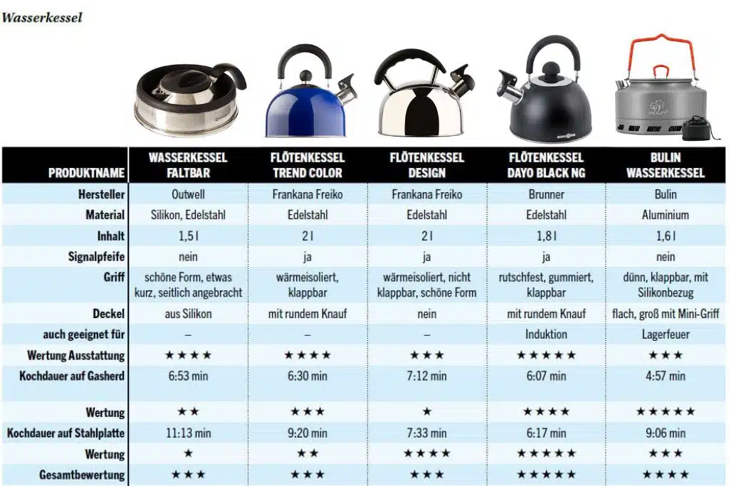 Das Testteam wollte checken, wie lange es dauert, bis das Wasser in den Kesseln kocht. Um aussagekräftige Ergebnisse zu bekommen, füllte es in jeden Kessel ein Liter Wasser. Nacheinander wurden die Fünf auf dem Gasherd eines Wohnwagens platziert und ein Liter Wasser erhitzt. Die Zeit bis zum Kochen beziehungsweise Ertönen der Pfeife wurde jeweils mit der Stoppuhr festgehalten. Verblüffend: Vier Kessel brauchen zwischen sechs und sieben Minuten. Nur der Bulin-Kessel aus Aluminium ist schneller und hebt sich mit einer Zeit von knapp fünf Minuten von seinen Konkurrenten ab. Sein Boden ist mit einem Wärmespeicher ausgestattet, um den thermischen Wirkungsgrad der Gasflamme zu verbessern. Zugegeben, mit einem elektrischen Wasserkocher geht das Kochen noch schneller – nach vier Minuten kocht das Wasser. Doch wie sagt man so schön: Abwarten … und Tee trinken.