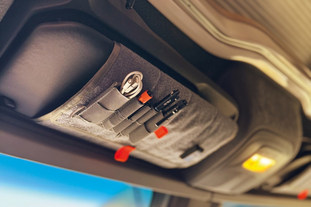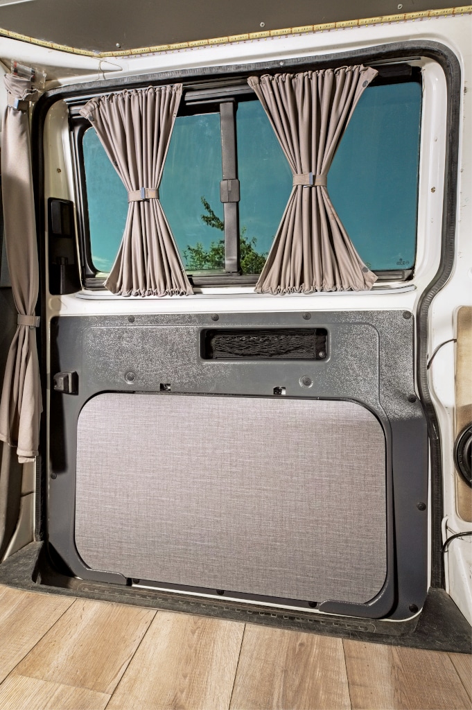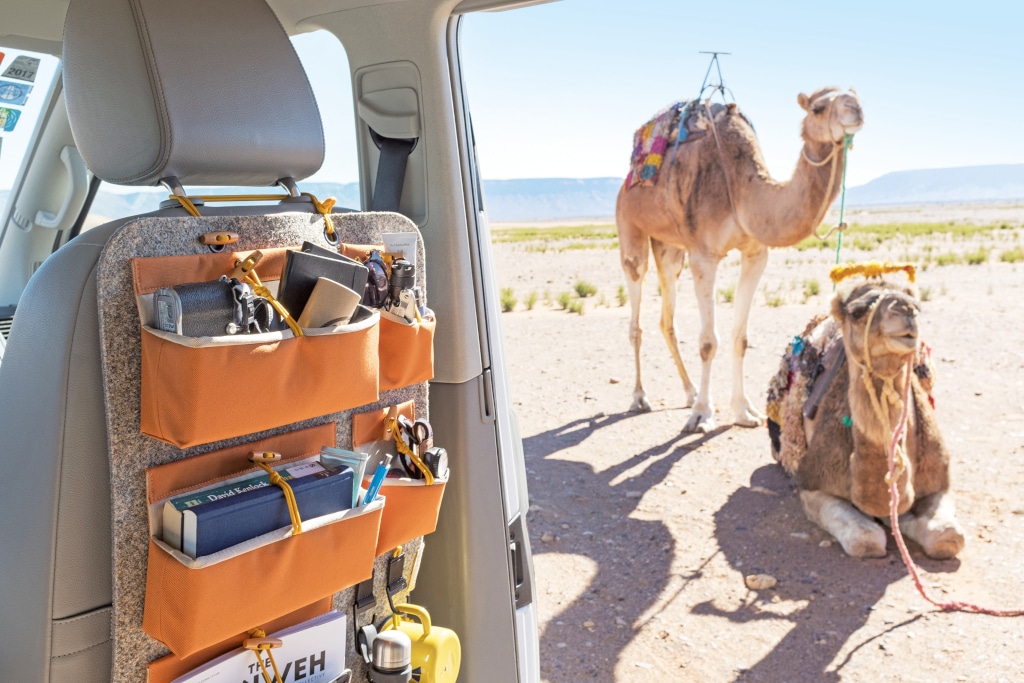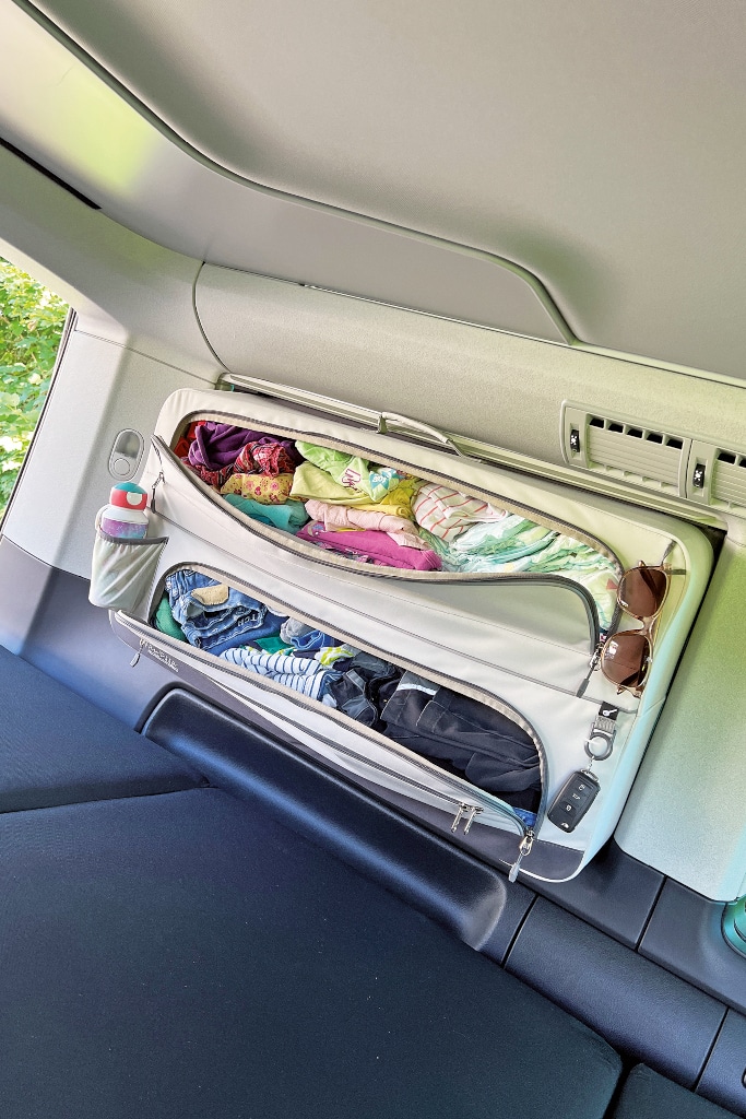 Das Original für den VW-Bus, das seit 2013 am Markt und mittlerweile auch für zahlreiche weitere Fahrzeuge erhältlich ist: die VanEssa- Packtaschen für den Fensterausschnitt zwischen der C- und D-Säule. Sie sind rund 15 Zentimeter tief und sinnvoll unterteilt, wodurch sich richtig viel Stauraum ergibt – fast 50 Liter pro Tasche!