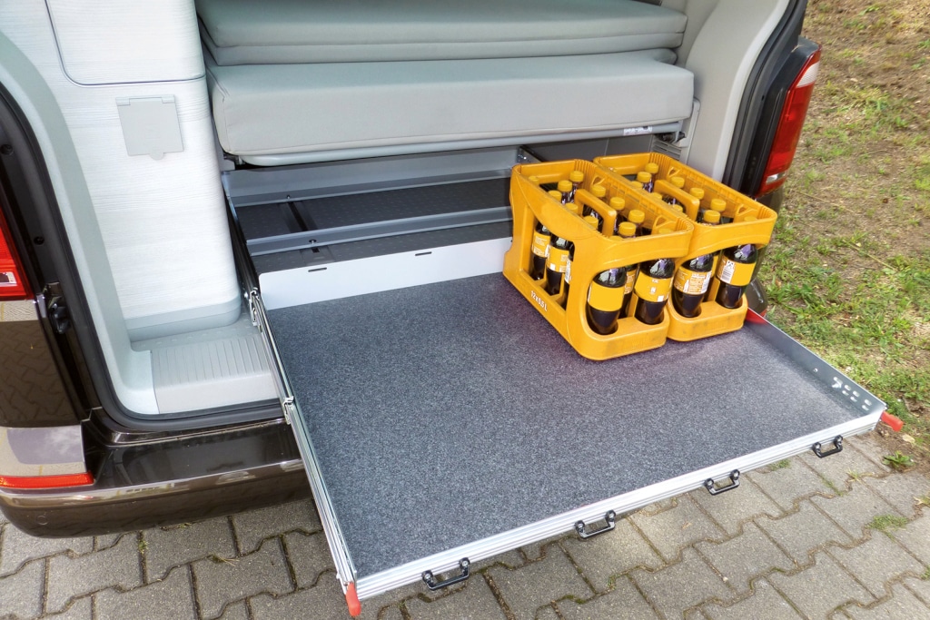Ein Heckauszug schafft zwar erst einmal keinen Stauraum – aber er hilft dabei, den vorhandenen Platz bestmöglich und komfortabel zu nutzen. Zubehör-Spezialist Reimo hat für verschiedene Basisfahrzeuge und Ausbauten eine passende Variante im Angebot, für Selbstausbauer gibt es die Vollauszüge, die im Set mit bis zu 250 Kilogramm belastet werden dürfen, auch einzeln.