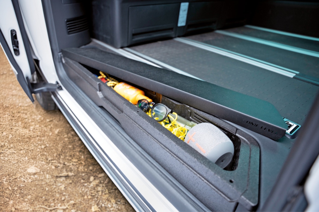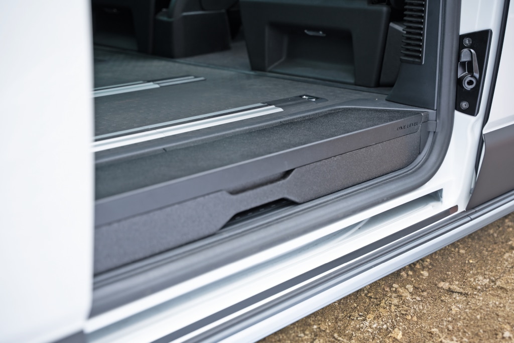 Wer am Bulli auf die Trittstufe verzichten kann, schafft mit der OneLevel Essential sechs Liter zusätzlichen Stauraum, Ordnung und etwa 10 Prozent mehr ebene Ladefläche. Das Fach für die Tritt- stufe passt beidseitig am Multivan, am California oder am Transporter mit Einstiegsleuchte, jeweils der Generationen T5 bis T6.1, und ist aus robustem und isolierendem EPP-Schaum, der Deckel aus mattschwarz-pulverbeschichtetem Aluminium gefertigt. So fügt sich die Box optisch nahtlos ins Design ein. Und natürlich darf sie als Tritt oder Sitzgelegenheit verwendet werden. Ein Clips-Set zur sicheren Befestigung liegt bei.
