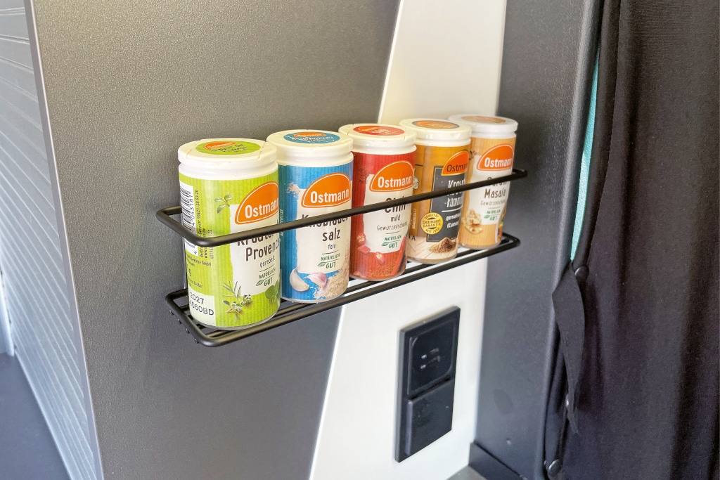 Die Firma Confurn aus Bad Oeynhausen steht für hochwertige Metall- und Kunststoff-Komponenten, die bereits in vielen Campervans von der Stange Verwendung finden. Wer etwas zusätzlichen Stauraum im Küchenbereich schaffen will, findet hier außerdem ein schickes Wandregal für Gewürzdosen, gefertigt aus mattschwarz-gepulvertem Stahl in filigraner Stab-Optik.