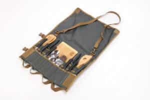 Nakatanenga Tool Roll „Hungry Edition“: Die 44,5 × 81 cm große, handgefertigte Besteckrolle bietet 18 Fächer für spülmaschinenfestes Besteck und ein vierteiliges Bambus-Kochlöffelset. Mit dabei: Schneidbrett sowie Koch- und Schneidmesser von WMF (nicht spülmaschinengeeignet). www.nakatanenga.de