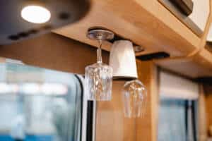 Fazit: In der Praxis sitzen Gläser und Tassen sehr sicher auf den Leisten. Nur bei starken Offroad-Einwirkungen sollte man Gläser nicht kopfüber aufhängen. Trotz festem Sitz lassen sich die Gläser komfortabel lösen und sind schnell zur Hand. Ein überzeugendes, wenn auch exklusives System mit hohem Alltagsnutzen – hochwertige Gläser, sicherer Stand und schnelle Erreichbarkeit. Sehr gut.