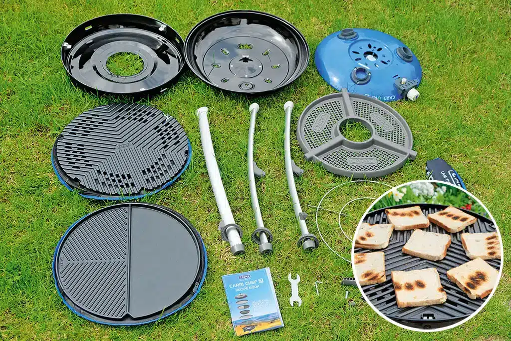 Fazit: Der Cadac Carri Chef 50 ist ein leistungsstarker All-in-One-Gasgrill, der mit umfangreichem Zubehör und einer Grillfläche von ø 46 cm für echten Grillgenuss auch beim Camping sorgt. Wenn der Deckel (mit Temperaturanzeige) geschlossen ist, entsteht ein Ofen, ideal zum Backen, Rösten oder Schmoren. Der Carri Chef 50 (auch als kleineres Modell 40 erhältlich) kommt dem echten BBQ-Feeling am nächsten, dafür ist er mit Abstand das teuerste Modell mit großem Platzbedarf, wenn sämtliches Zubehör mit auf Tour geht.