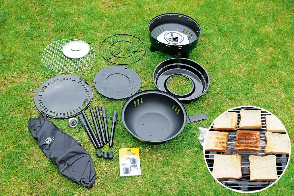 PRO (+) + Leistungsstarke Edelstahlbrenner (hohe Temperatur) + Integriertes Thermometer + Automatische Piezozündung + Gleichmäßige Hitzeverteilung dank integriertem Wärmedeflektor + Modular-System: Umfangreiches optionales Zubehör + Variabel: auch ideal zum Backen, Schmoren, Rösten + Schnelle Montage mit leichten Aluminium-Beinen ohne Werkzeug + Ausgeklügelte Tragetasche(n)