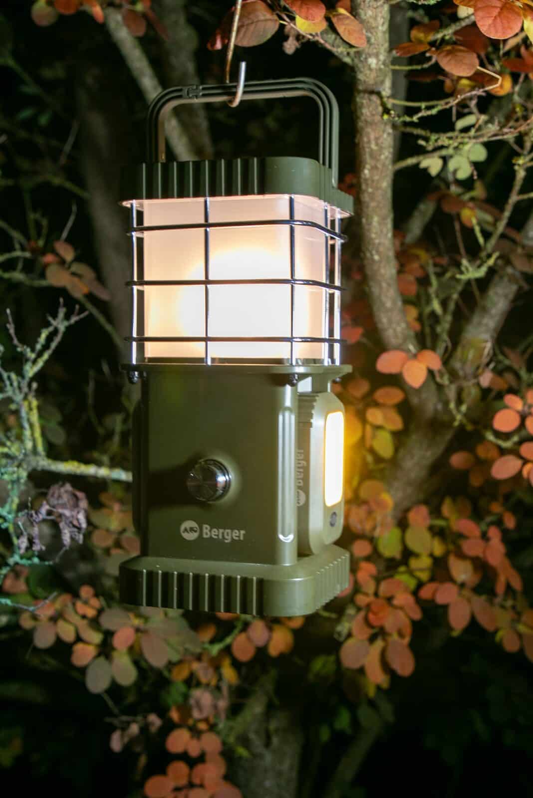 Die Berger Samar Campinglaterne ist die größte Leuchte in unserer Testreihe und mit 1,33 kg auch das schwerste Produkt. Dafür sorgt ein olivgrünes Gehäuse aus ABS und Stahl, das nach IP44 gegen Spritzwasser geschützt ist. Die kompakte Leuchte verfügt über zwei abnehmbare Seitenlampen, die als Orientierungsleuchten oder auch als Taschenlampen verwendet werden können.