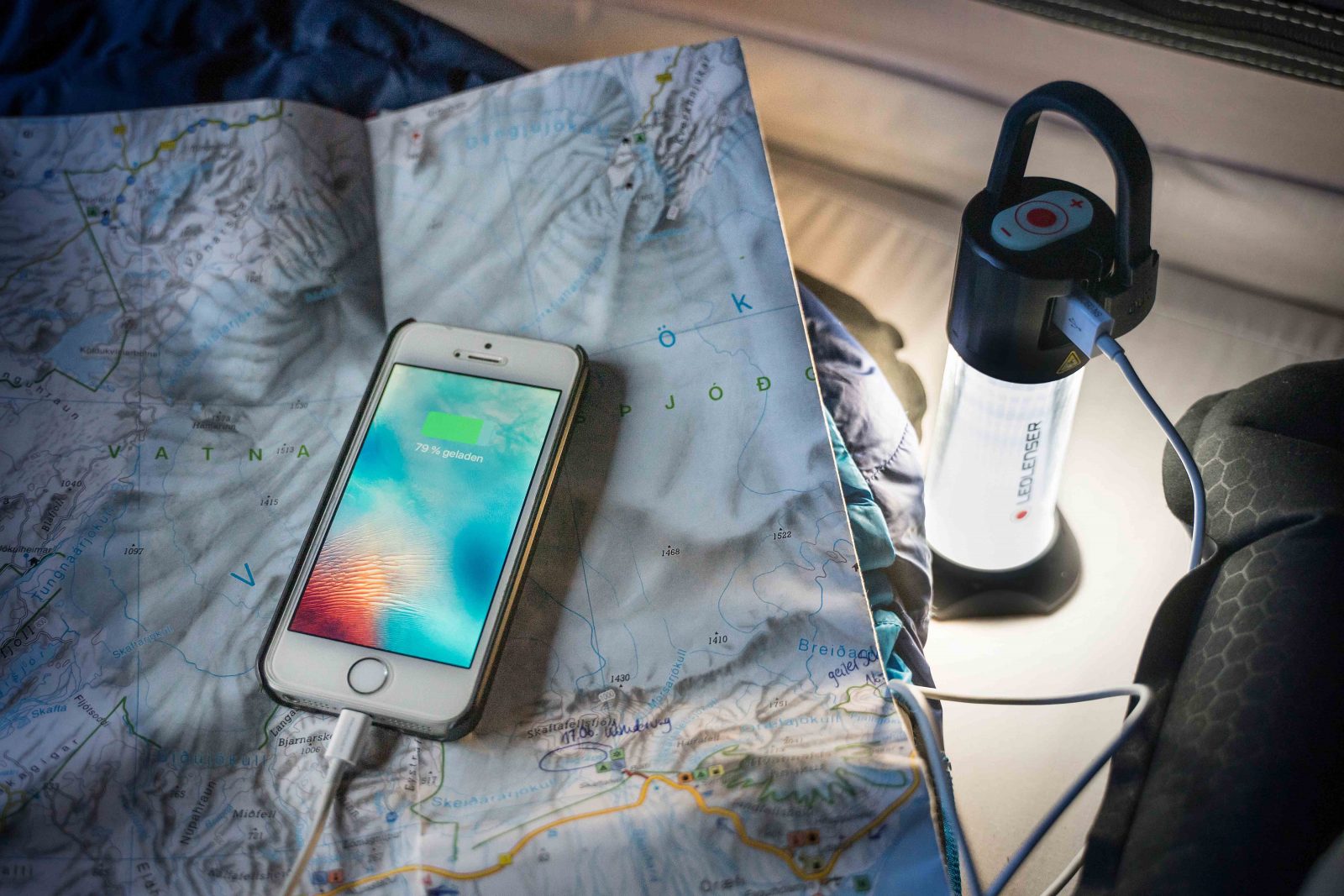Wechsel zwischen den verschiedenen Blink- und SOS-Modi, sowie dem Rotlicht, die allesamt nicht wirklich zum Einsatz kamen, aber auch nicht stören. Hier kann die Campinglampe außerdem zwischen einer Lichtstärke von 5 Lumen im Low-Power-Modus bis hin zu 750 Lumen im Boost-Modus gedimmt werden. Je nach Lichtstärke soll der Lithium-Ionen-Akku bis zu 200 Stunden durchhalten. Im Realbetrieb an einem verlängerten Wochenende konnten wir die ML6 erst kleinkriegen, als wir sie dank integriertem USB-Anschluss als Powerbank für unsere Smartphones verwendeten. Dann kann die Lampe aber bequem wieder im Campervan
