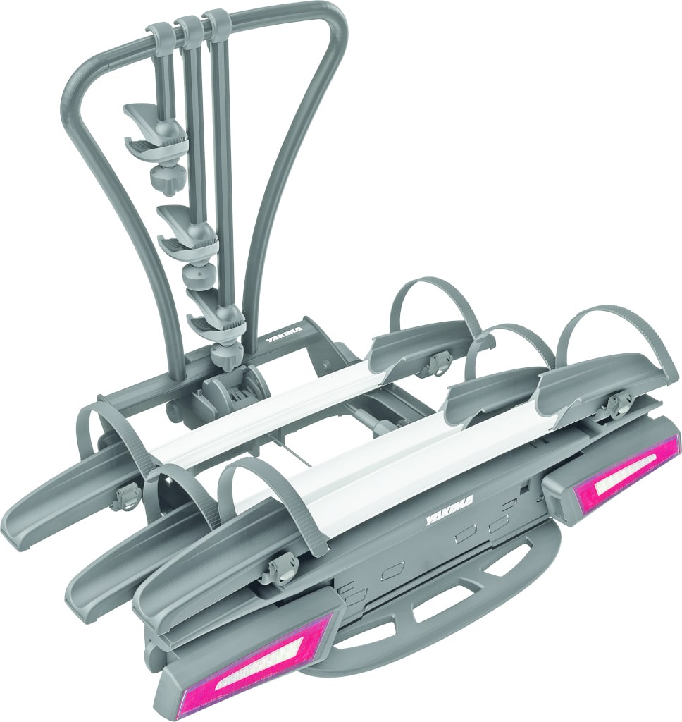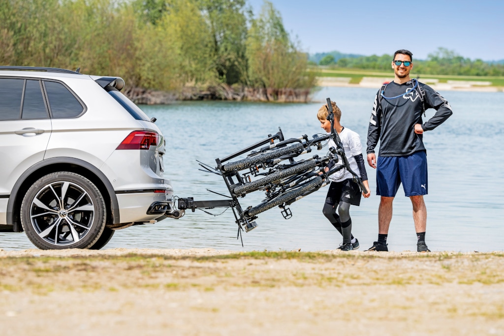 Mit Platz für zwei oder drei Bikes und der Möglichkeit, ein weiteres hinzuzufügen, ist dieser Anhängerkupplungsträger ein technisches Wunderwerk und perfekt für alle Biker. Das einfache „Just Click“-System erleichtert die schnelle und sichere Montage auf der Anhängerkupplung. Der Yakima lässt sich auch weit nach hinten abklappen, um Hecktüren oder die Kofferraumklappe öffnen zu können. Mit drei Schienen wiegt der Träger 20,3 Kilogramm, die mögliche vierte Schiene macht zwei Kilo mehr. Auch hier wird das Gesamtgewicht der Zuladung mit 60 Kilogramm angegeben, bei vier also eher Carbon-Rennräder als E-MTBs aufladen.