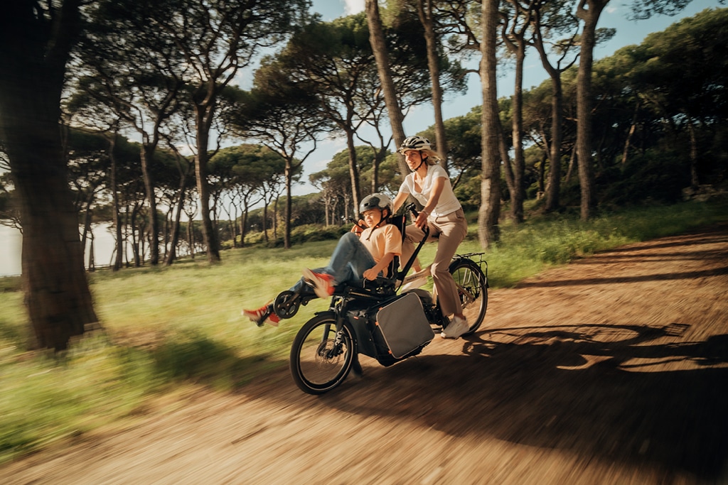 Der „Captain“ sitzt hinten auf einem Sattel, der „Stoker“ vorn – ganz nah und in Hörweite – im Sitz. Durch den starken Motor und vielseitiges Reha-Equipment ist das Pino E auch für Personen mit Handicap geeignet. Der Clou: Mit wenigen Handgriffen wird aus dem Tandem für Zwei ein Solo-Lastenrad, das allein auf dem Vordersitz bis zu 120 kg trägt. Durch den teleskopierbaren Rahmen passt es auf jeden Heckfahrradträger.